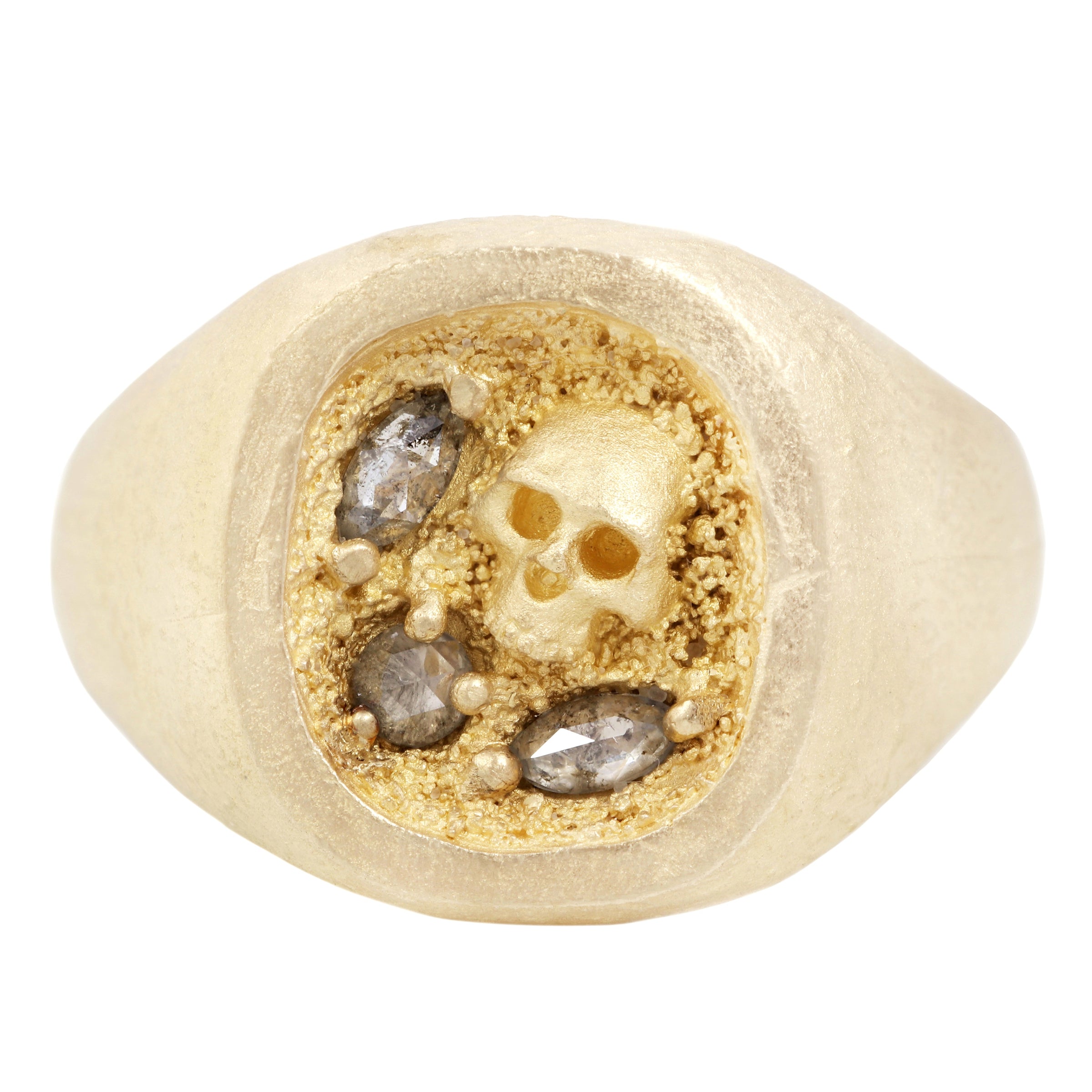 A wearable dig of forgotten archeological treasures in a hand sculpted signet ring. Substantial ring, made of solid gold, with scattered Salt and Pepper Diamonds glittering like unearthed grave goods. Hand sculpted human skull peeks out from the golden "dirt". An ode to the wonder of ancient treasures and the thrill of discovery. Substantial.