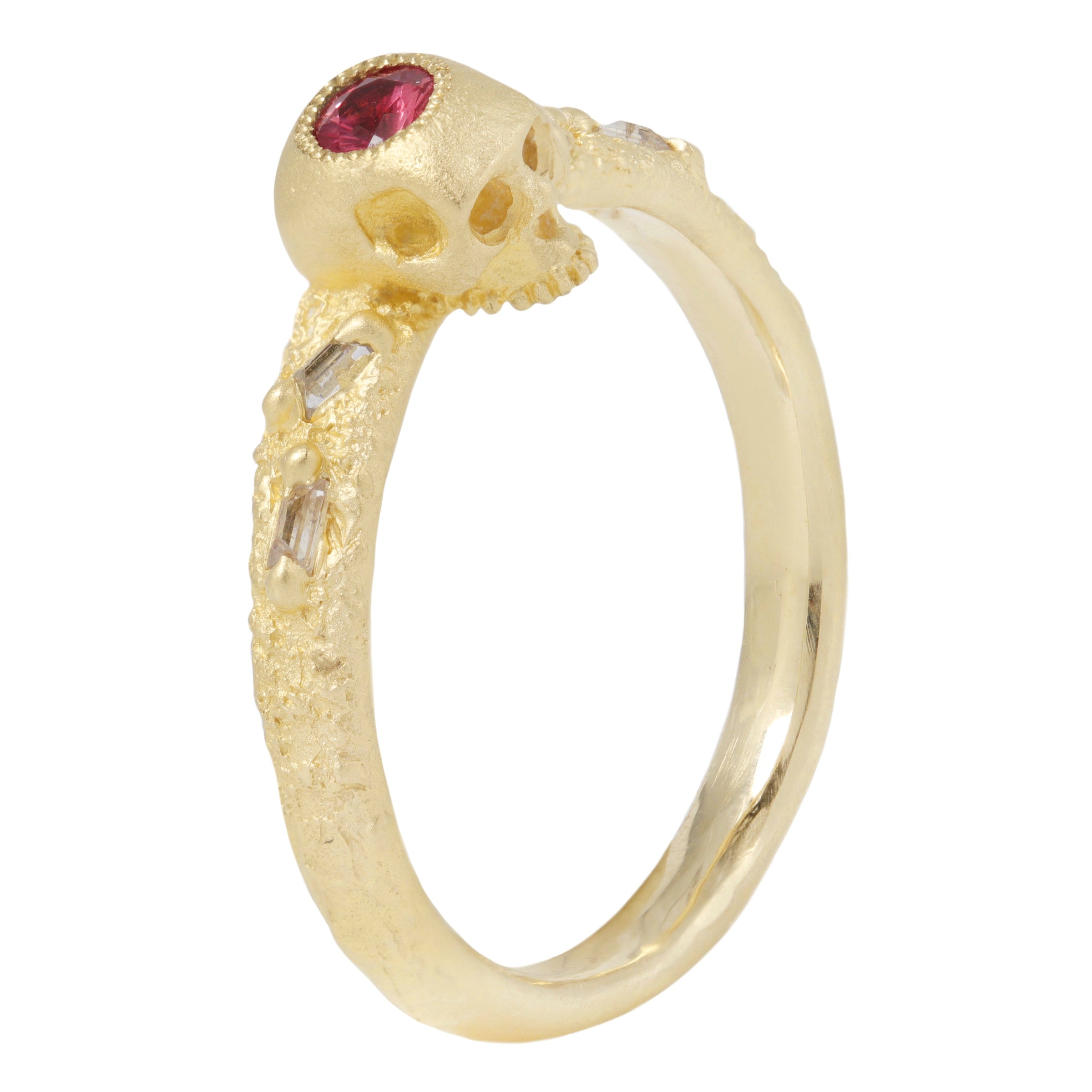 An ancient skull uncovered, with worldly baguette diamond treasures scattered about in the golden sand. A breathtaking, fiery Nyala Ruby brain glitters from within.